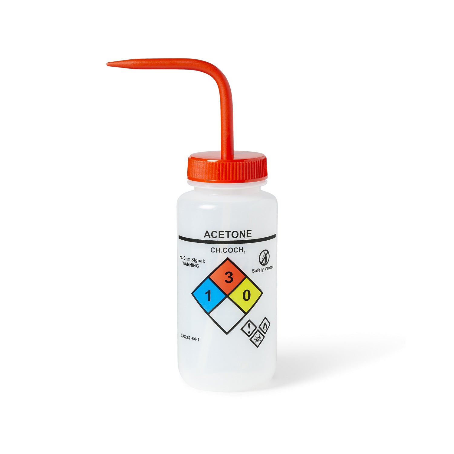 "extra_description": "Ensure safe and accurate dispensing of acetone with United Scientific® UniSafe™ 500mL vented wash bottles. Made from durable LDPE with a polypropylene vented cap and stem, these bottles are pre-labeled with critical safety information including the chemical name, formula, CAS number, and NFPA hazards. Designed for labs and classrooms, each bottle is GHS and OSHA compliant for safe chemical handling."