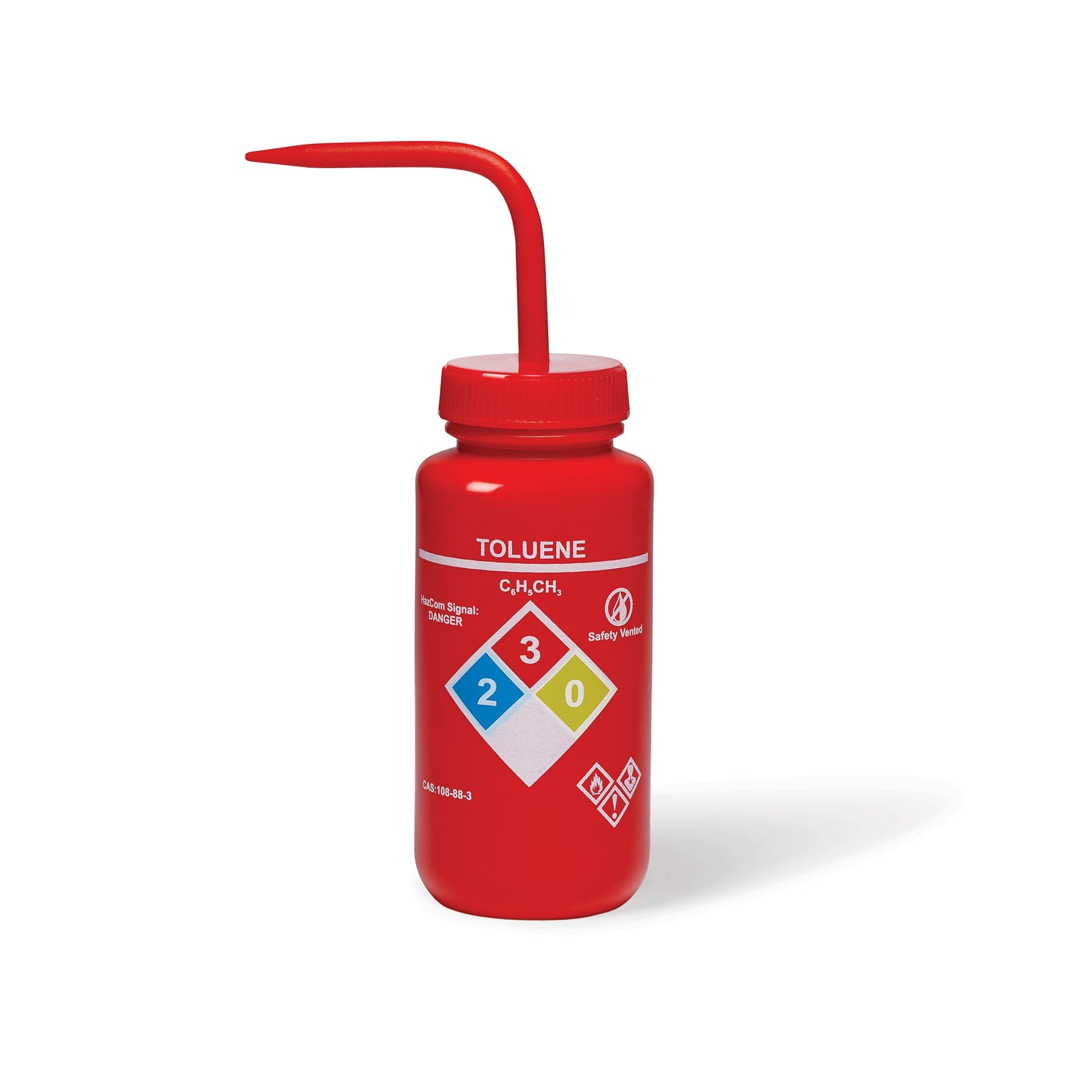 "extra_description": "Handle toluene with confidence using UniSafe™ 500mL wash bottles by United Scientific®. These LDPE bottles are vented for pressure control and pre-labeled with full hazard and chemical details according to GHS and OSHA guidelines."