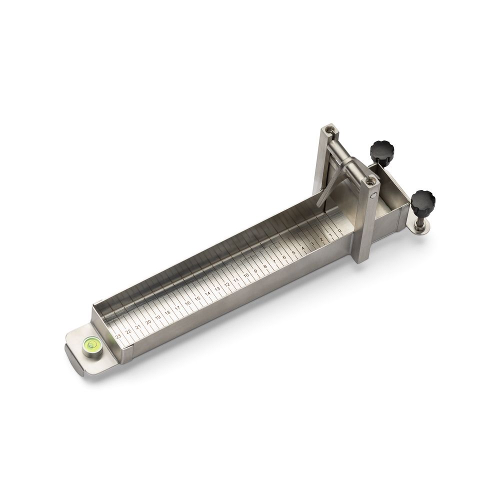Constructed from durable polished stainless steel, it offers long-lasting performance and easy cleaning. The engraved 0.5 cm measurement increments provide clear and accurate readings, while the spring-loaded gate holds up to 75 mL of sample and releases instantly for consistent testing. For enhanced accuracy, the instrument is equipped with two leveling screws to adjust the angle and a built-in spirit level for precise alignment.