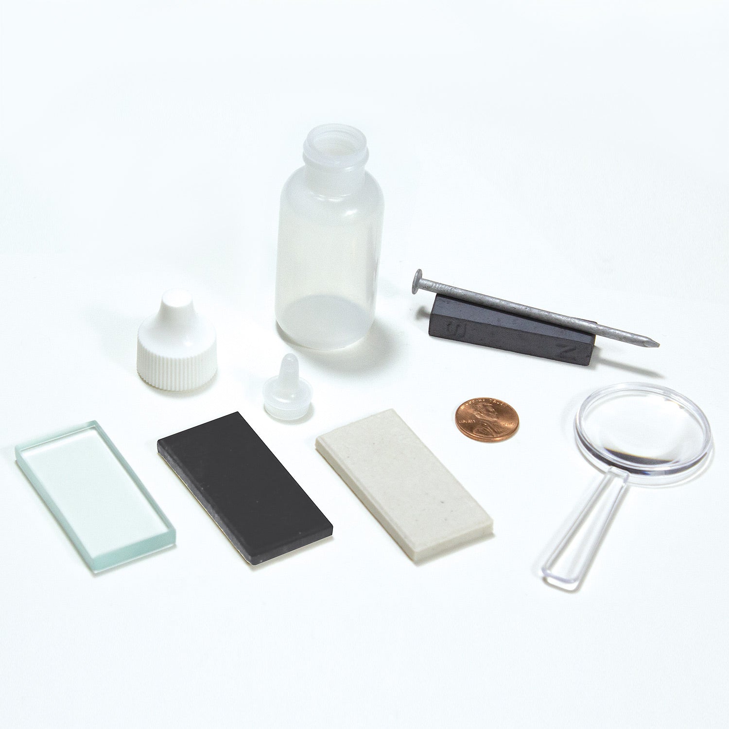 Complete rock and mineral testing kit – includes hardness scale, streak plates, dropper, and more