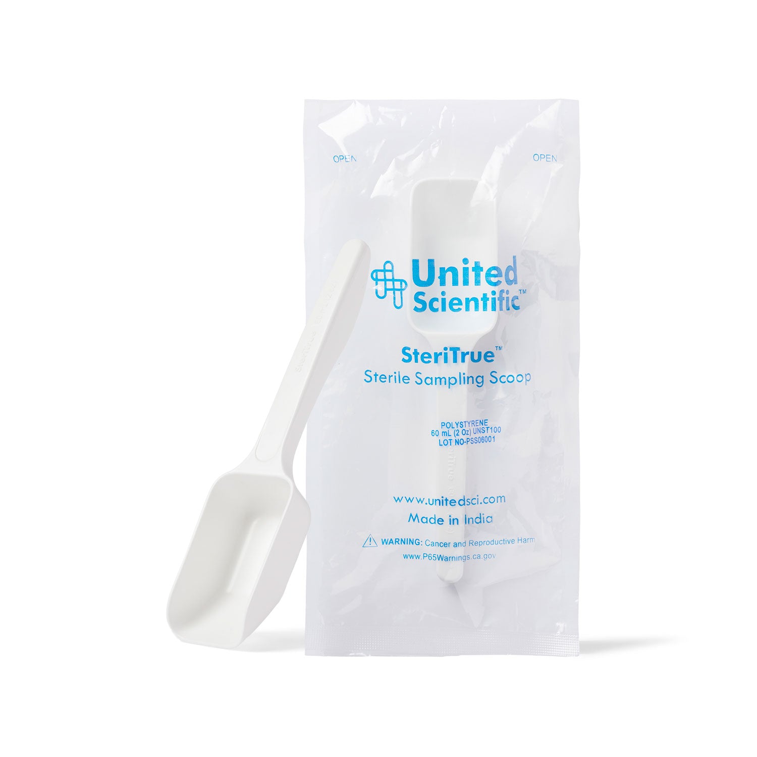 "extra_description": "Ensure precision and hygiene in every sample with United Scientific® Steritrue™ Sterile Sampling Scoops. These 60 mL (2 oz) polystyrene scoops are ergonomically designed for long use, featuring a flat bottom for stability during weighing and a reinforced long handle for durability. Individually gamma-sterilized and lot-stamped for full traceability, they meet FDA guidelines and are safe for food, pharmaceutical, and laboratory applications. Perfect for bulk sampling in labs, quality control, food safety, and R&D environments."